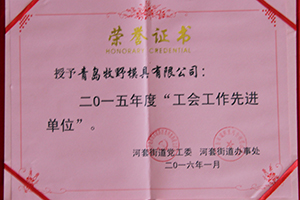 Muye Mold won the title of “advanced unit of enterprise union in 2015” by Qingdao Hongdao Economy Zone General Chamber of Industry.